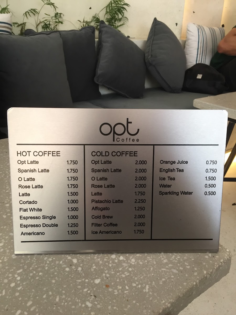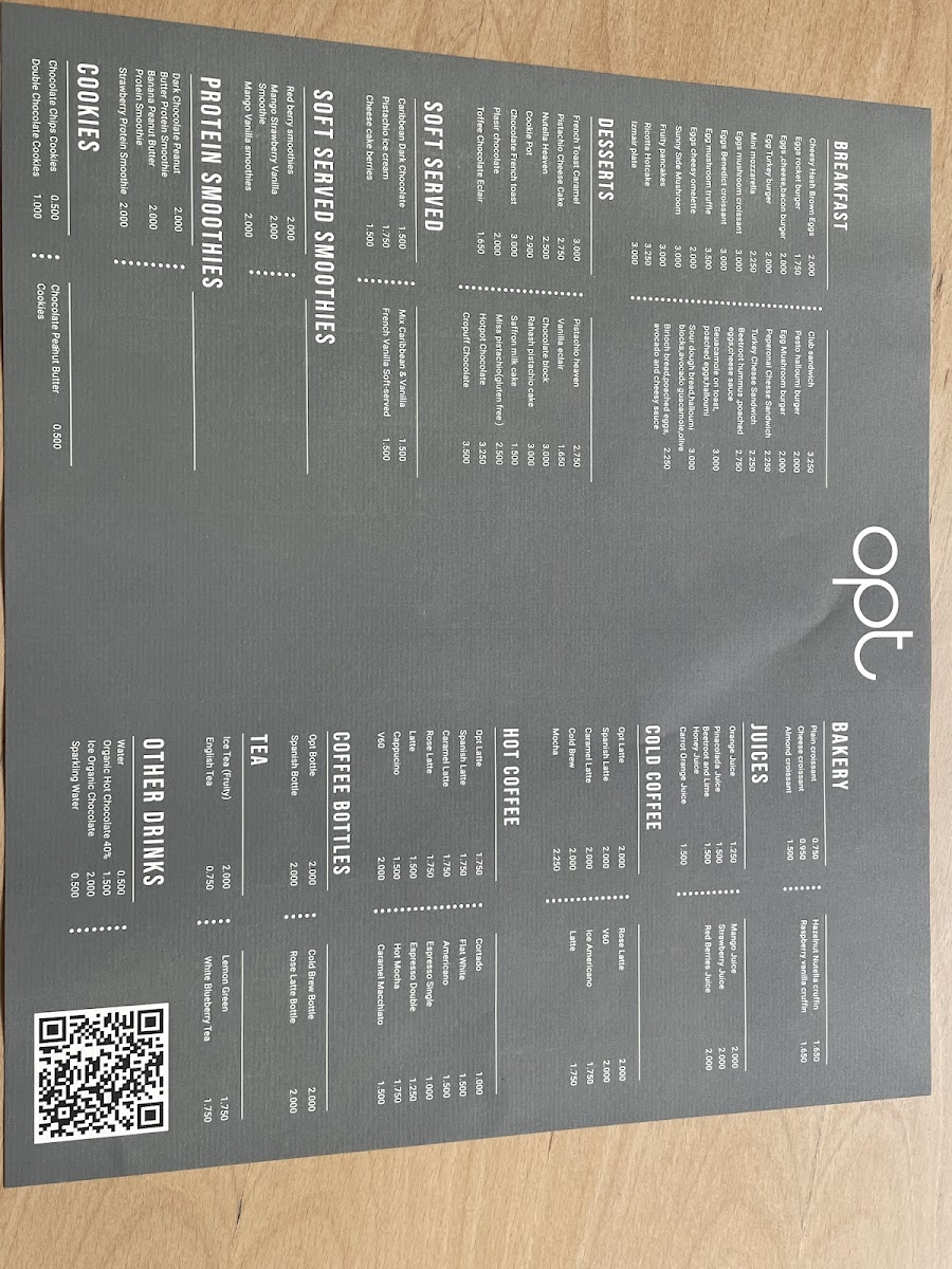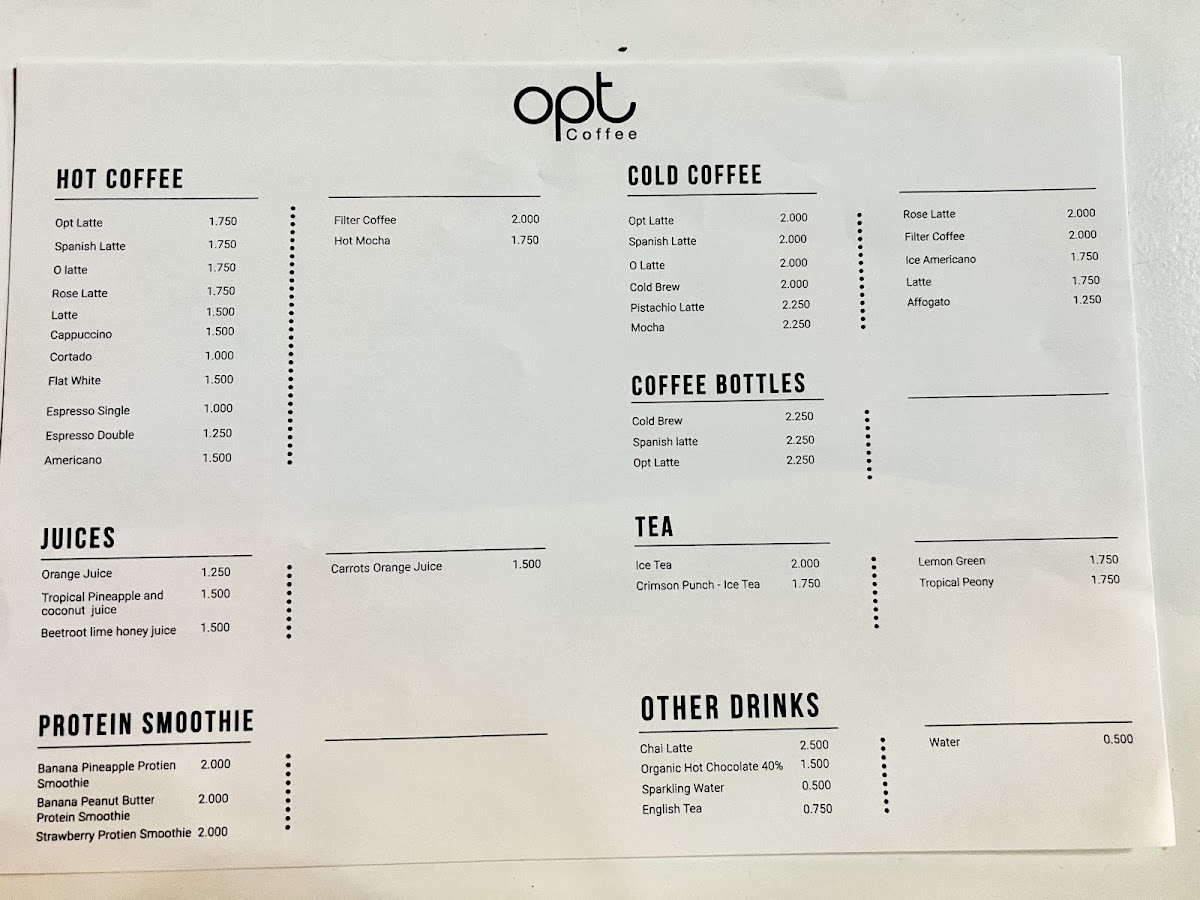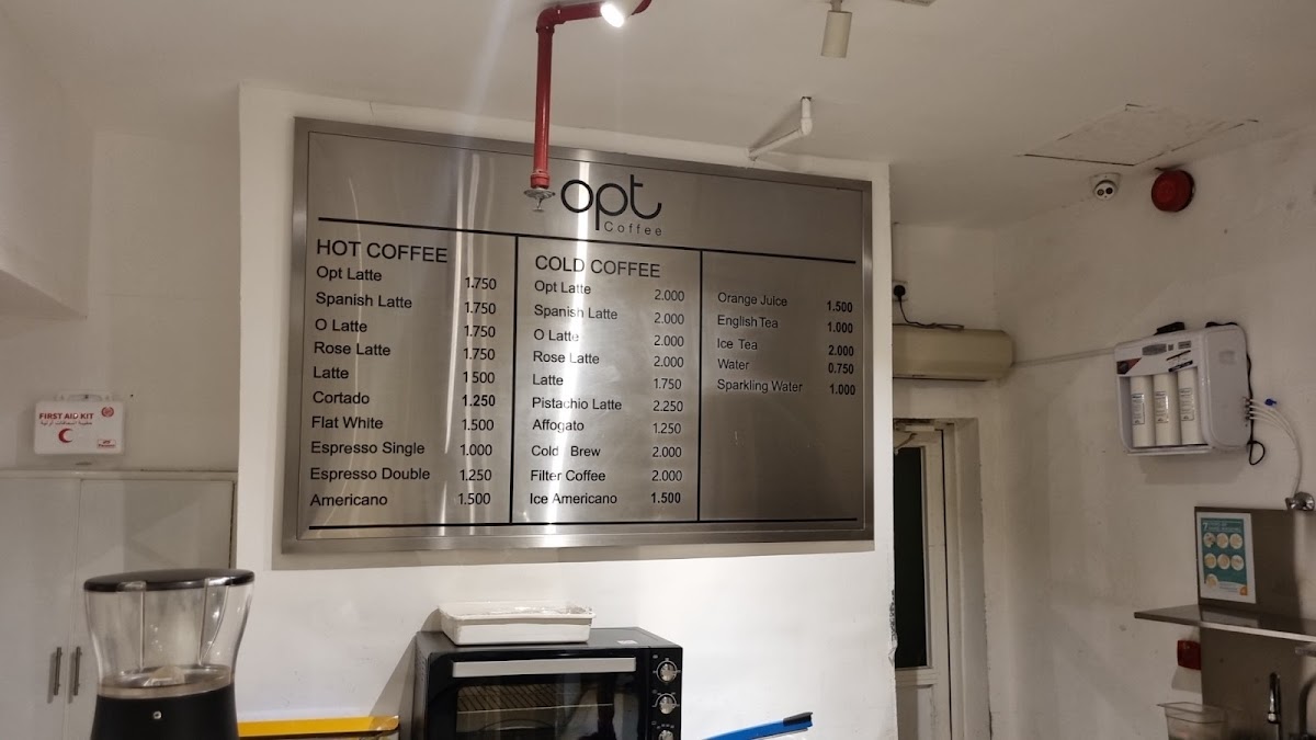 The menu at Opt Coffee (Al-Bida) offers a delightful variety of drinks, baked goods, sandwiches, and desserts, making it a great destination for coffee enthusiasts and food lovers alike. For coffee lovers, there’s an array of options like Iced Latte, Cappuccino, and the signature Ice Opt Latte, with a special touch in their hot beverages like the Hot Matcha Latte and Hot OPT Latte. The roasted coffee beans selection is just as impressive, featuring the Colombian Filter Coffee Bean (250g) and Ethiopia Filter Coffee Bean (250g and 500g), perfect for those who enjoy brewing their own coffee at home. New additions include the Ice Filter Coffee and Ice Americano in a generous 20oz (Big Size) serving. When it comes to bakery items, their Almond Croissant and Caramel Pecan Croissant stand out, along with the Honey Kiri Danish and indulgent Double Chocolate Cookie. For a savory snack, the Avocado Sando, Potato Pave, and Truffle Cheese Mushroom Sandwich are all worth trying, alongside the flavorful Club Sandwich and Avocado Halloumi Toast. The dessert options are equally tempting, with treats like the decadent Tiramisu Cake, the delightful Mix Heaven, and the gooey Cookie Pot. The Eclair Variety Box and Nutella Heaven offer a sweet ending to any meal, making it clear that Opt Coffee offers something for everyone, whether you're in the mood for a hot drink, a savory bite, or a sweet indulgence.